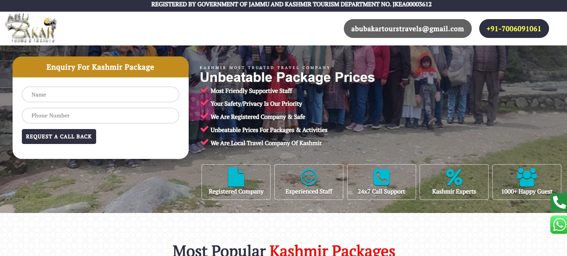 Established in 2016, Abu Bakar Tours and Travels is a government-registered travel company based in Kashmir, specializing in curated tour packages that showcase the region's natural beauty and cultural heritage. Their offerings include guided tours, taxi services, and houseboat stays, providing travelers with authentic and memorable experiences. With a focus on safety, privacy, and unbeatable package prices, they cater to various destinations such as Srinagar, Pahalgam, Gulmarg, Sonmarg, and Doodhpathri. Their experienced staff and 24x7 support ensure a seamless travel experience for all clients.